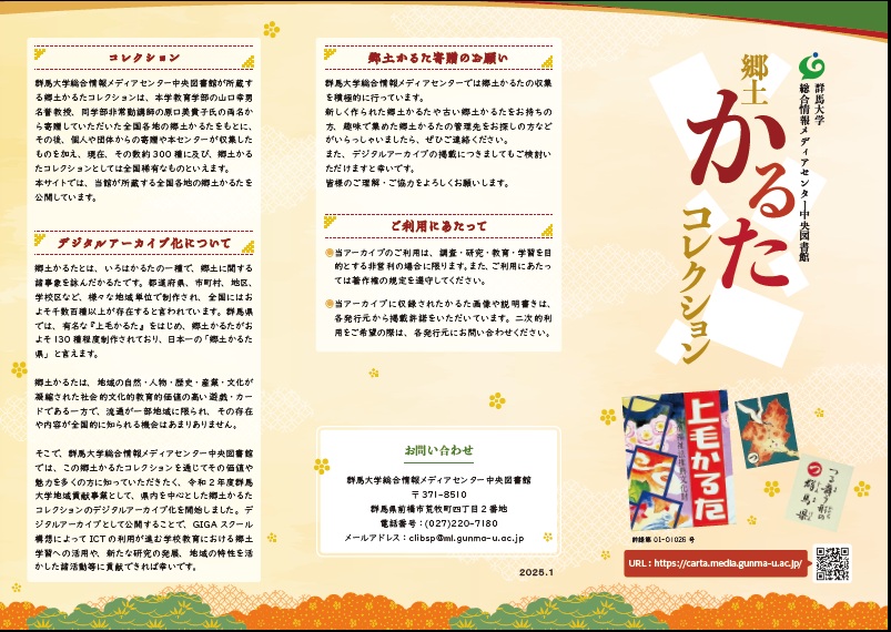 郷土かるたコレクションのリーフレットデータです。本サイトの操作方法は内面の「郷土かるたデジタルアーカイブ使い方」を参考にしてください。